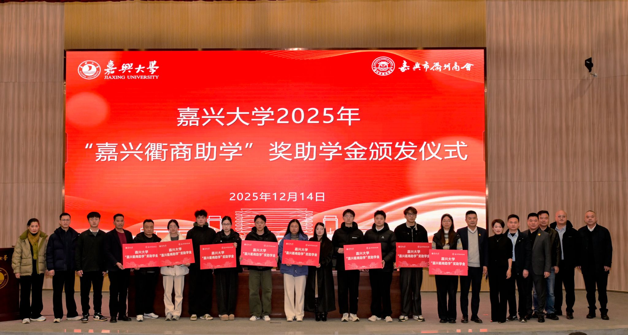 岁末温情聚,助学暖人心。12月14日,嘉兴大学2025年“嘉兴衢商助学”奖助学金颁发仪式在梁林校区行政楼一楼报告厅举行。嘉兴市南湖区政协主席章剑,嘉兴市工商联党委副书记、副主席范剑春,嘉兴市衢州商会会长吴红军、轮值会长樊和良,学校组织部部长、统战部常务副部长、学工部部长葛建伟等领导及相关师生齐聚现场,活动由学工部副部长叶砚主持。