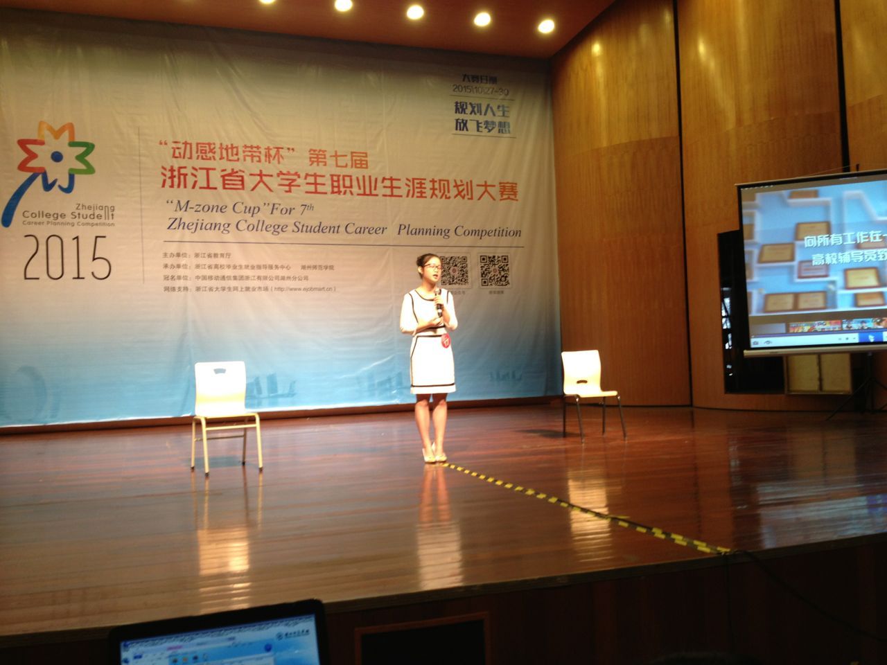 2015年10月27日至10月30日,浙江省第七届大学生职业生涯规划大赛决赛在湖州师范学院举行。经过激烈的角逐,我校季汉华同学的《捕风卓影,云尚传媒》获创业规划类一等奖,并获“2015度浙江省最佳创业规划之星”;汪玲珑同学的《花开有时》和陈慈宗同学的《译路欢声笑语》获职业规划类二等奖;另有3个作品获三等奖,10个作品获优胜奖。